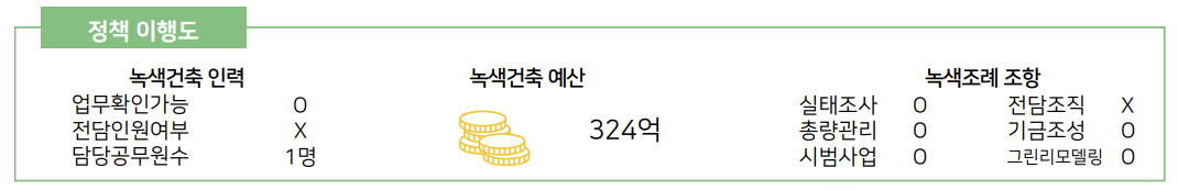 업무확인 가능 및 전담 인원 여부와 담당 공무원 수를 통해 인적역량을 파악하고, 지자체의 녹색 건축 예산과 활성화를 위해 마련된 녹색 조례 조항 여부를 평가하였다. 경상북도는 인적역량 부문에서 66점(최고점 108점)으로 약간 미흡 수준, 예산 비중은 76점(최고점 86점)으로 약간 우수 수준, 정책기반은 48점(최고점 82점)으로 전체적으로 정책이행도 영역에서는 미흡하다고 평가되었다.