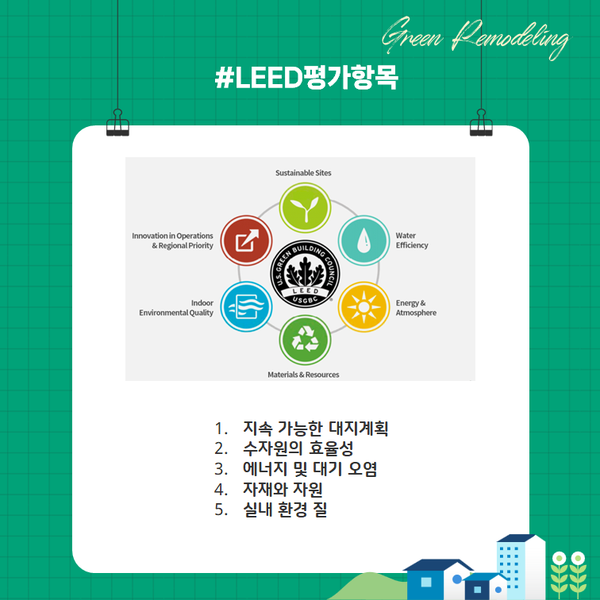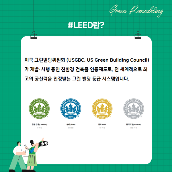 LEED는 미국의 민간단체인 미국그린빌딩협의회(USGBC)에 의해 1998년 시행되고 있는 미국 친환경건축물인증제도입니다.