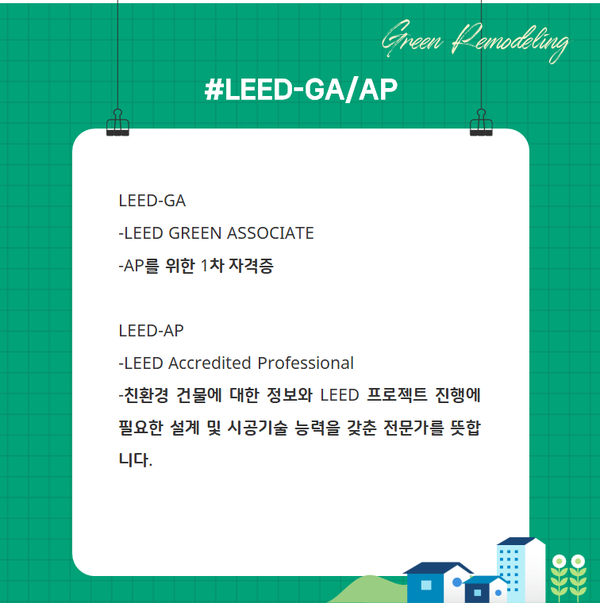 LEED Accredited Professional(AP)는 USGBC(미국 그린빌딩 협회)에서 인정하는 국제공인 자격증입니다. 친환경 건물에 대한 정보와 LEED 프로젝트 진행에 필요한 설계 및 시공기술 능력을 갖춘 전문가를 뜻합니다.