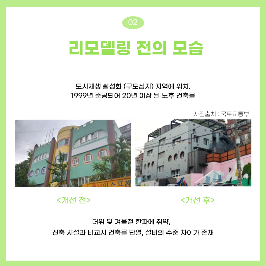 오늘 소개해드릴 제 1호 그린리모델링 사례는 광명시에 위치하고 있는 철산 어린이집 입니다. 철산 어린이집은 도시재생 활성화 (구도심지) 지역에 위치하고 있으며, 1999년도에 준공되어 20년 이상이 된 노후 건축물에 속하여 있었습니다. 더위 및 겨울철 한파에 취약하였으며, 신축 어린이집의 설비 시설과 비교하였을 때 건축물의 단열, 설비 수준의 차이가 상당함에 따라 구도심 지역 아이들의 보육 환경 개선 및 탄소 중립에 따른 저에너지 건축물 구현을 위해 그린 리모델링 사업이 추친되었습니다. 기존 규모를 유지하면서, 패시브 기술인 고단열, 고기밀 단열재와 창호 그리고 액티브 기술인 콘덴싱 보일러, LED 조명, 태양광 에너지 등을 적용하여 냉난방 에너지 사용량 절감을 통해 온실가스 감축 및 이용자 쾌적성 증대를 위하니 제로 에너지 건축물이 되도록 계획되었습니다. 본 리모델링에 적용된 기술을 자세히 알아보겠습니다.