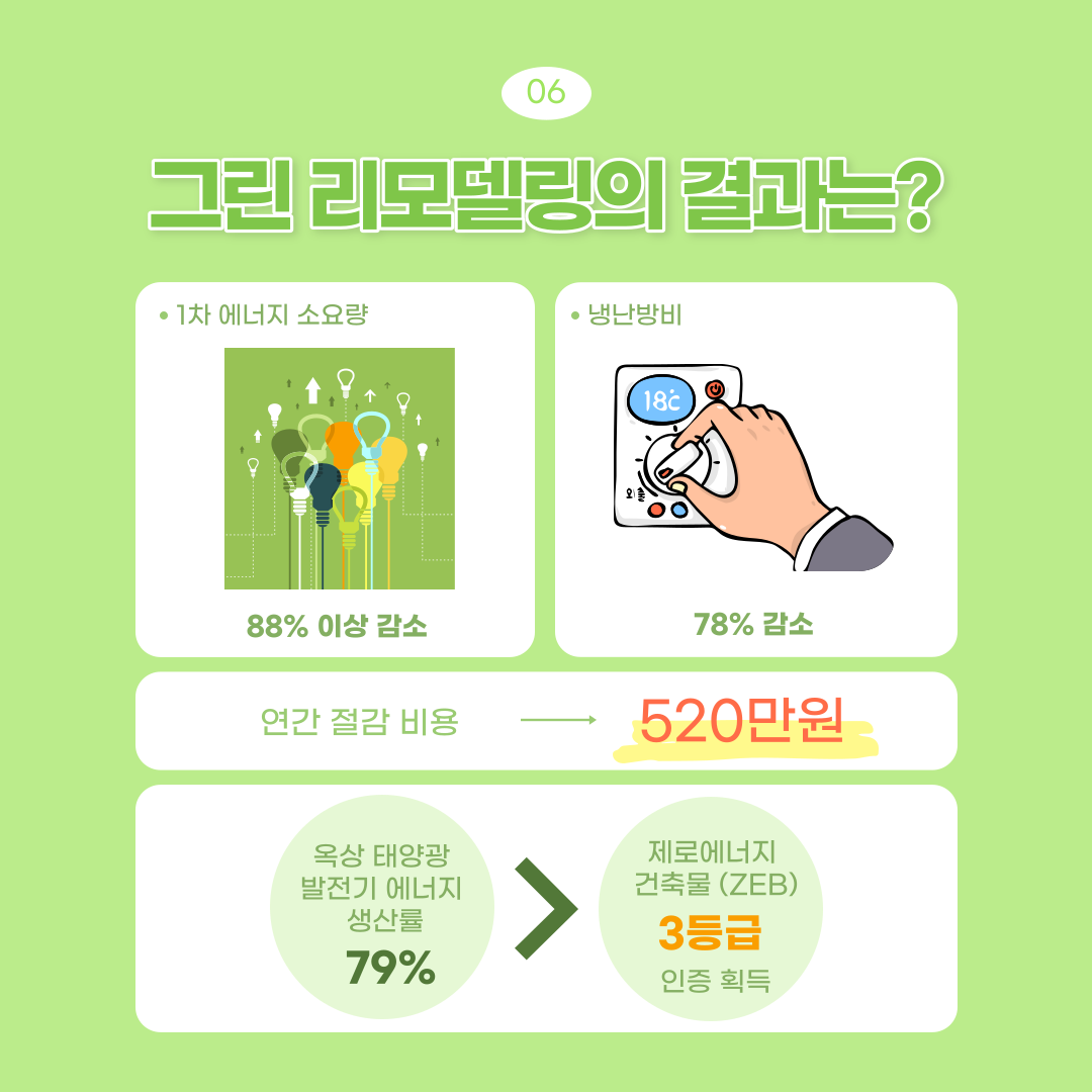 이렇게 사례를 통해서 그린 리모델링의 기술에 대해 알아보았습니다. 리모델링 후의 결과는 1차 에너지 소요량이 88%, 냉난방비는 78%가 감소하여 연간 520만원 가량을 절감할 수 있는 것으로 추청됩니다. 옥상에 설치된 태양광 발전기는 에너지 생산률이 높아 제로에너지 건축물(ZEB) 3등급 인증을 받게 되었습니다.