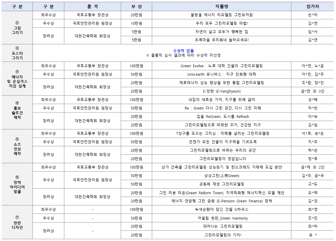안녕하십니까, 국토안전관리원 그린리모델링 창조센터입니다. ′제5회 그린리모델링 챌린지′ 부문별 수상작이 아래와 같이 선정되었으며, 수상을 축하드립니다. ※ 수상자에게는 시상식 및 추가 안내가 개별 연락됩니다. 공모전에 참여해주신 모든 분들께 다시 한 번 감사 드리며, 앞으로도 그린리모델링 사업에 지속적인 관심 부탁드립니다. 수상 관련 문의사항은 챌린지 운영사무국(070-4938-6293)으로 연락바랍니다.