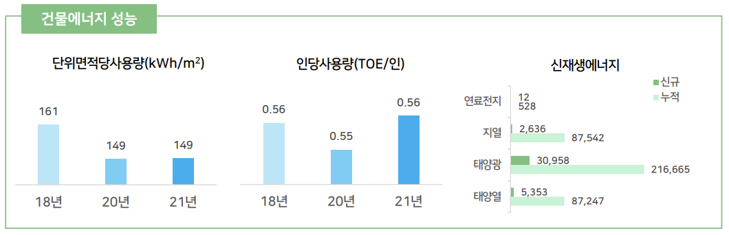 녹색건축물 인증도입률은 지자체별 건축물의 녹색건축물 인증, 에너지효율등급 인증, 제로에너지 건축물 인증을 받은 건축물의 등급별 연면적의 총합과 공공/민간의 비중을 고려하여 평가되었다. 그린 리모델링은 어린이집, 보건소, 의료시설의 공공그린 리모델링 건수, 민간그린 리모델링 예산을 토대로 평가되었다. 공공 그린리모델링의 경우 보건소, 어린이집, 의료시설 순으로 건수가 많았으며, 민간 그린리모델링 예산은 전년도인 21년도에 비해 약 2배가량 증가한 것을 확인할 수 있다. 경상북도의 평가 결과는 녹색건축물 인증도입률은 88점(최고점 100점), 그린리모델링 도입률 92점(최고점 92점)으로 둘 다 우수 수준으로 평가되었다.