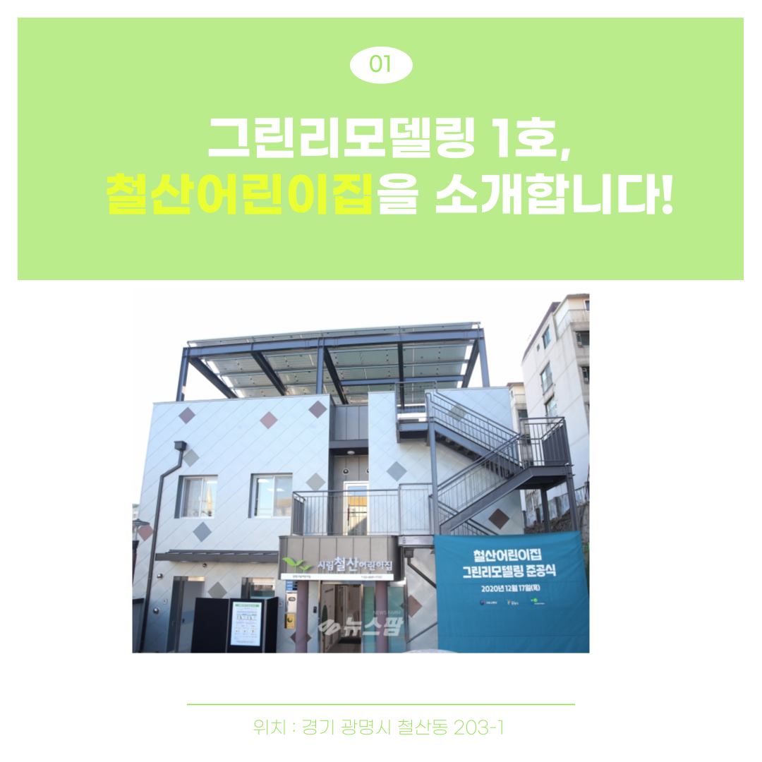 오늘 소개해드릴 제 1호 그린리모델링 사례는 광명시에 위치하고 있는 철산 어린이집 입니다. 철산 어린이집은 도시재생 활성화 (구도심지) 지역에 위치하고 있으며, 1999년도에 준공되어 20년 이상이 된 노후 건축물에 속하여 있었습니다. 더위 및 겨울철 한파에 취약하였으며, 신축 어린이집의 설비 시설과 비교하였을 때 건축물의 단열, 설비 수준의 차이가 상당함에 따라 구도심 지역 아이들의 보육 환경 개선 및 탄소 중립에 따른 저에너지 건축물 구현을 위해 그린 리모델링 사업이 추친되었습니다. 기존 규모를 유지하면서, 패시브 기술인 고단열, 고기밀 단열재와 창호 그리고 액티브 기술인 콘덴싱 보일러, LED 조명, 태양광 에너지 등을 적용하여 냉난방 에너지 사용량 절감을 통해 온실가스 감축 및 이용자 쾌적성 증대를 위하니 제로 에너지 건축물이 되도록 계획되었습니다. 본 리모델링에 적용된 기술을 자세히 알아보겠습니다.