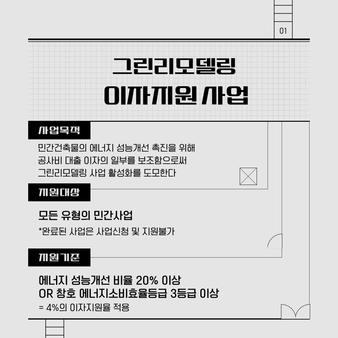 민간건축물의 에너지 성능 개선 촉진을 위해 공사비 대출 이자의 일부를 보조함으로써 그린리모델링 사업 활성화를 도모하는 것입니다.