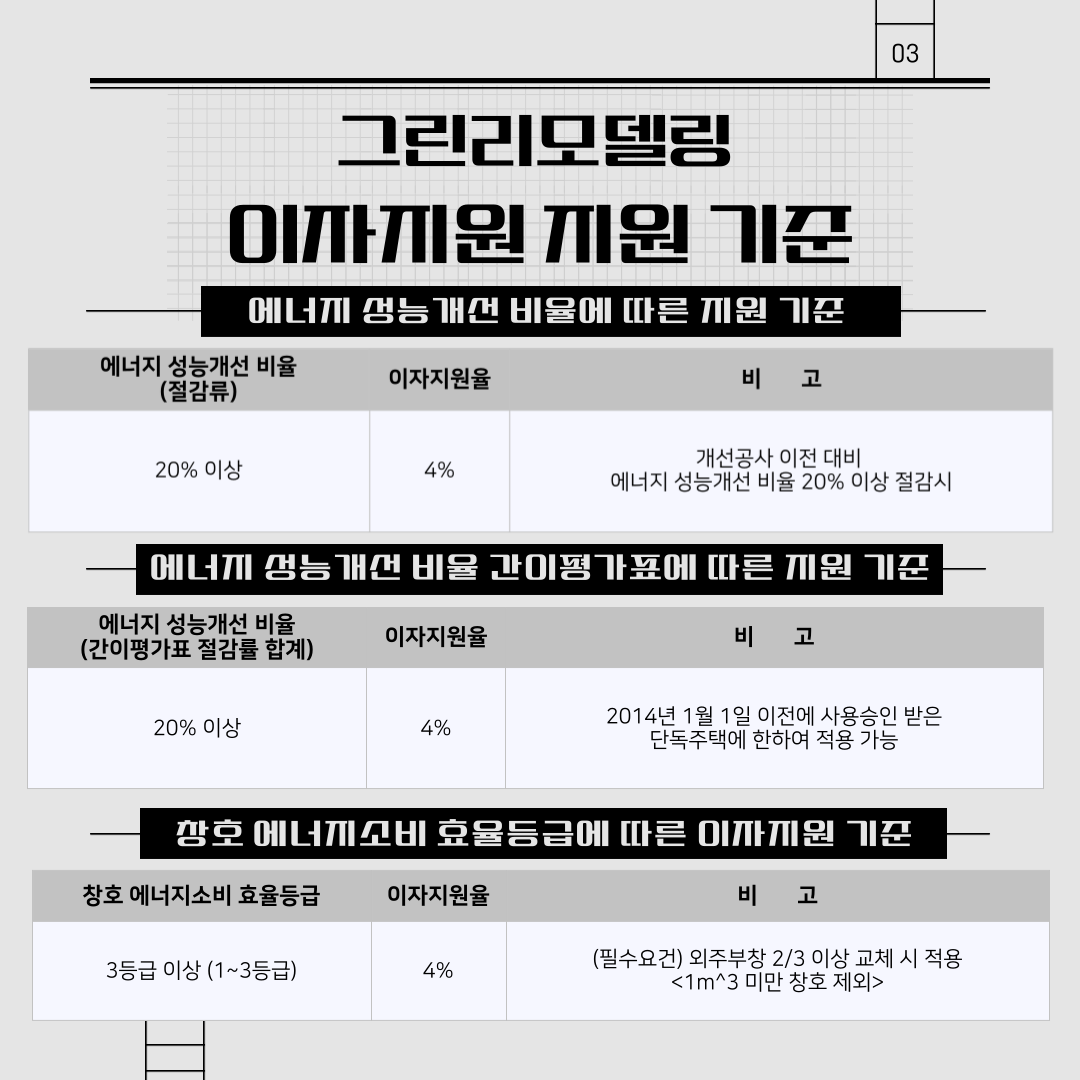 에너지 성능 개선 비율 20% 이상 혹은 창호 에너지소비 효율등급이 3등급 이상인 경우 지원합니다.
